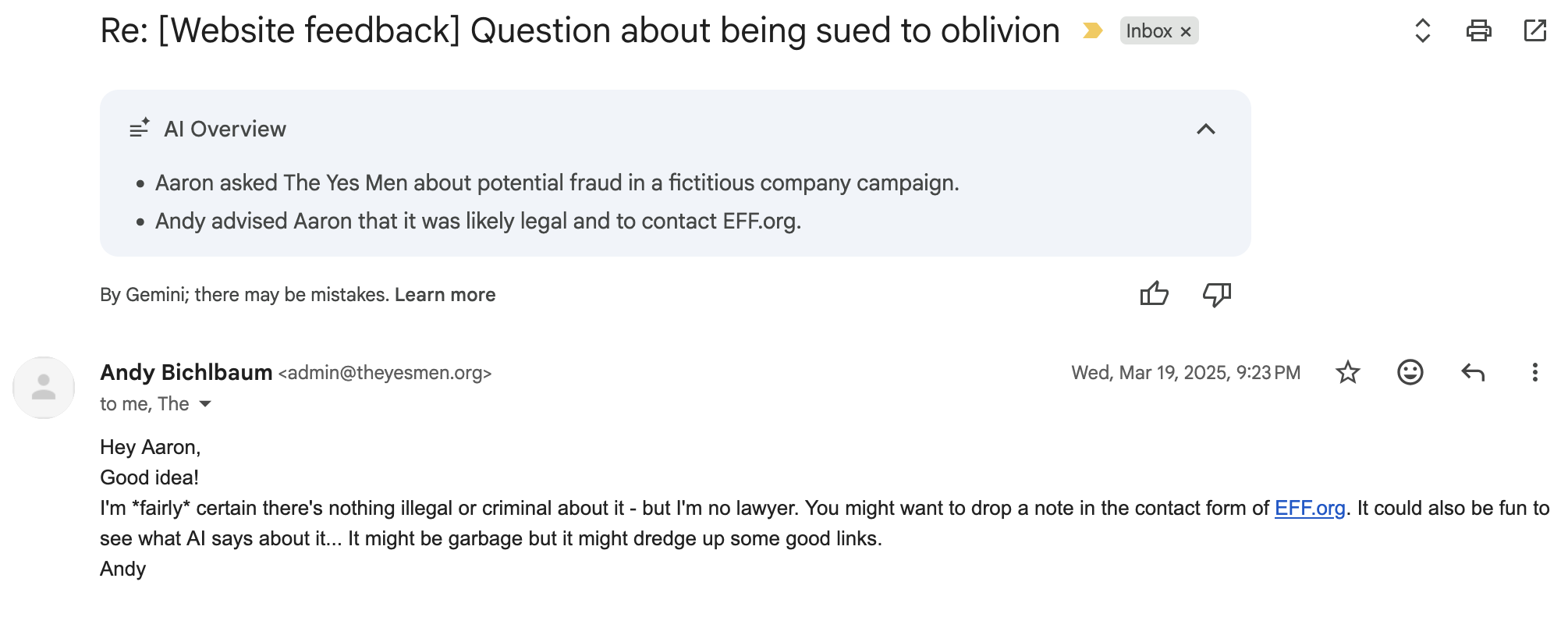 You don’t feel that sort of thing when you stop volunteering at the food bank or donating to the Red Cross. We doubt that The Yes Men ever felt glad a campaign was over.